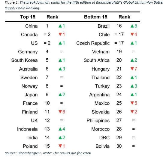 China reclaimed the #1 spot in BloombergNEFās 2025 Global Lithium-Ion Battery Supply Chain Ranking, overtaking Canada and the U.S.